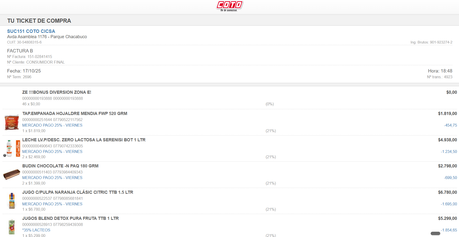 Only Coto gives us an itemized receipt that lets us analyze every product, and luckily, it includes a QR code linking to a digital version of the receipt. Example: