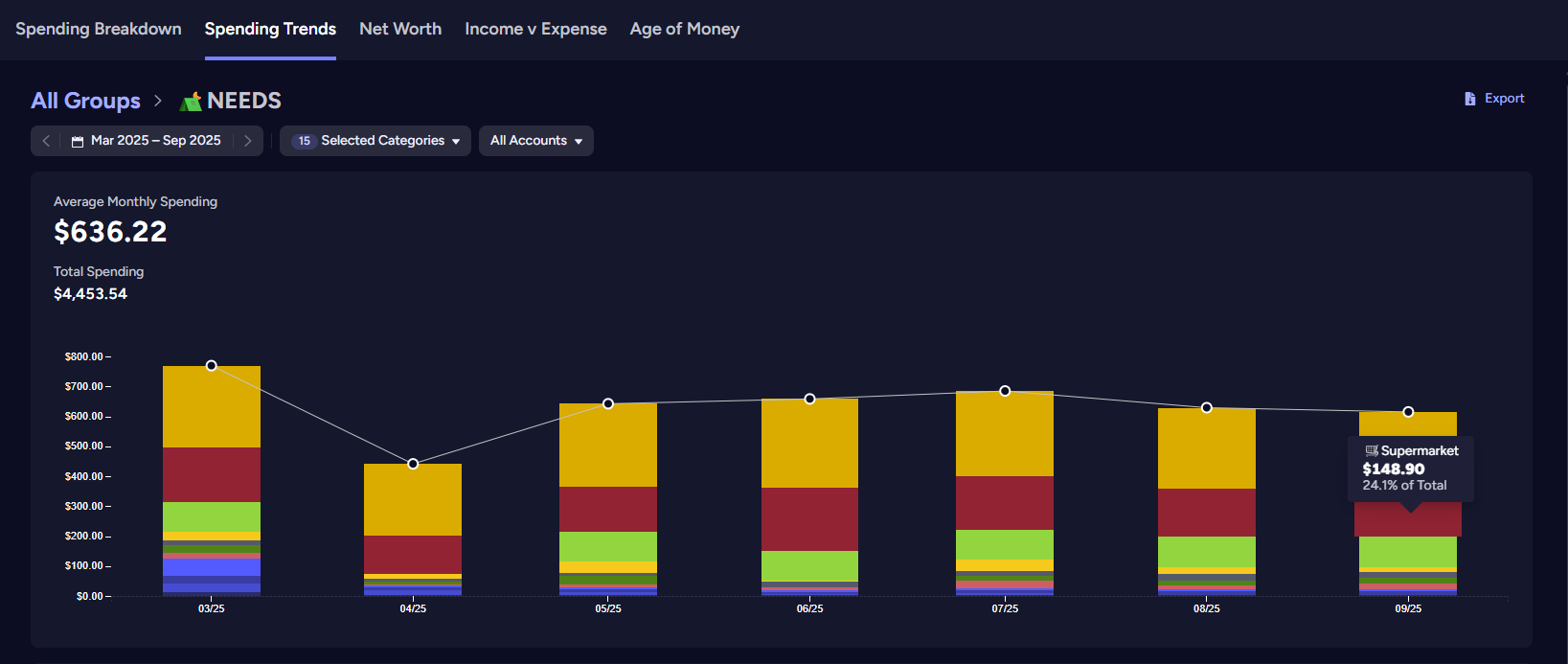 My YNAB's spending trends report from the Needs category group, which includes our shared expenses like rent (yellow) and supermarket (burgundy):
