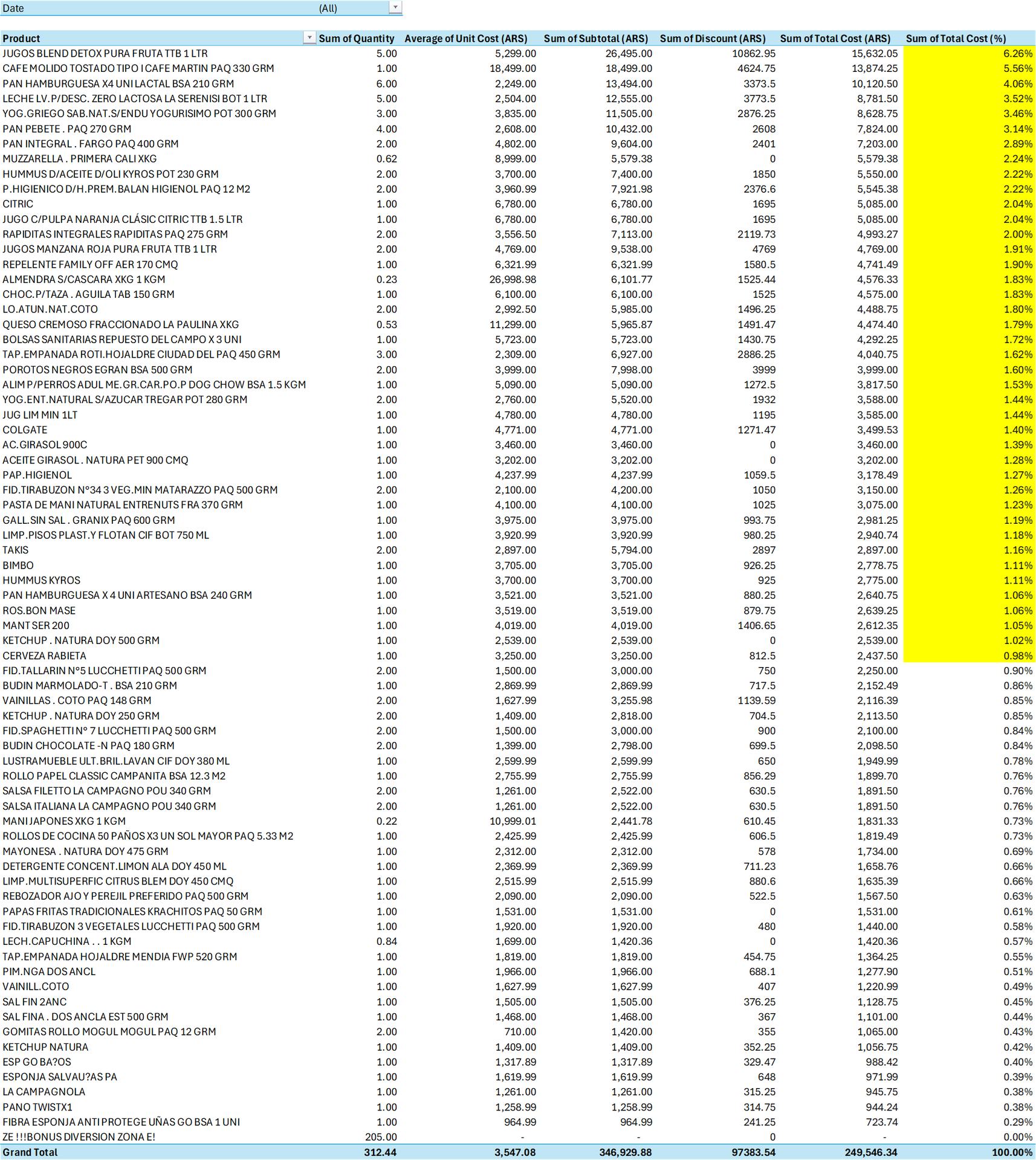 - We analyzed the clean data from all October invoices using Excel's pivot tables, focusing on the products that make up 80% of our spending (the pareto, in yellow), and came up with the decisions.